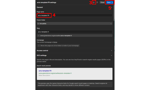 2- dans la liste, choisir la page "actu template FR", cliquer sur la mollette