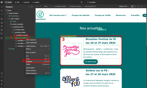 1- A gauche de l'écran, choisir "card_actualite_FR". Au clic droit dessus, cliquer sur "dupliquer". Vous avez 4 actualités, effacer une actualité au clic droit pour toujours conserver 3 actus.